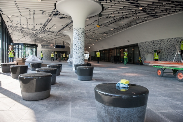 De stationshal maakt deel uit van het door Mecanoo architecten ontworpen stadskantoor, dat begin 2016 gereed moet zijn. In december levert de NS, de eigenaar van de stationshal, op aan de winkels op aan de huurders voor verdere inrichting. Aan de bovenliggende verdiepingen wordt nog gewerkt en volgend jaar bouwt BAM het resterende deel van het complex.