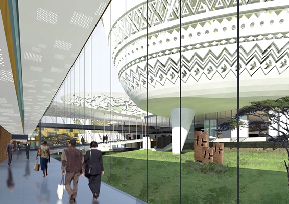 Het idee voor het ontwerp is om een sterk symbolische vorm te maken, waarbij volledig gebruik wordt gemaakt van de situering tegen de heuvel, midden in de stad Addis Abeba. De compositie van het gebouw bestaat uit drie onderdelen: een plein op de top van de heuvel, kantoorringen die onder het plein tegen de heuvel zijn geschoven en een drietal volumes op het plein met de belangrijkste vergaderzalen.