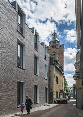 De ongelijke tweedeling in de voorgevel refereert aan de twee panden die er voorheen stonden. Daarnaast sluit de tweedeling aan op de parcellering van de gevels aan de Steenweg. Ook in dakvorm voegt het gebouw zich in het daklandschap van de binnenstad.