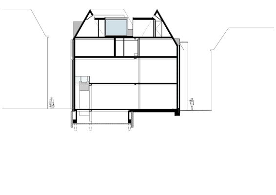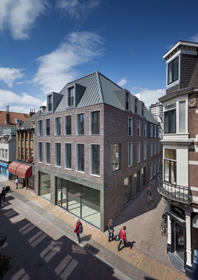 Het nieuwe pand volgt de rooilijnen en goothoogtes van de oorspronkelijke bebouwing. Dit resulteert ook in een subtiele geleding in hoofd- en bijgebouw. Het ritme van de raamopeningen volgt deze geleding en vertoont een klassieke ordening.