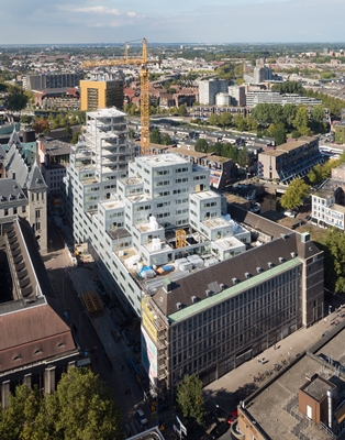 Afgelopen weekend is het hoogste punt van het Timmerhuis in Rotterdam gevierd. In het gebouw tussen de Coolsingel en het Laurenskwartier komen onder meer kantoren, woningen en winkels. De opening staat voor najaar 2015 gepland.