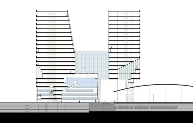 Drie bouwlagen, bestemd voor parkeren en technische voorzieningen, vormen een podium waarop de stationshal en het Stadskantoor staan. Op dit publieke niveau, 7,5 meter boven het maaiveld, ligt de entree tot het stadskantoor aan een centrumboulevard. De boulevard loopt langs de nieuwe stationshal en verbindt de gebieden aan beide zijden van de sporen.