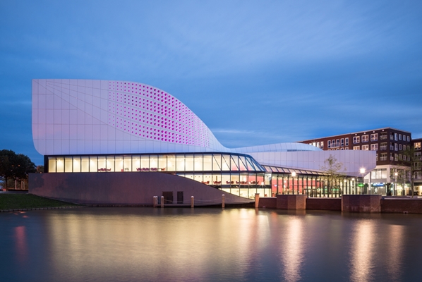 In het ontwerp van UNStudio wordt deze situatie maximaal uitgebuit. Het theater wordt aan de pleinzijde beschreven door een verzameling van golvende lijnen. Van Berkel verklaart dat de golvende lijnen ingegeven zijn vanuit de aerodynamica: het gebouw mocht geen extra windlast veroorzaken voor de verderop staande monumentale molen. Maar zonder die opgave had Van Berkel vast een andere aanleiding hiervoor gevonden. De golvende daklijn toont ook prachtig de kleinere en grotere zaal die eronder liggen. De golvende lijnen verbindt de zalen en scheidt die tegelijkertijd ook.