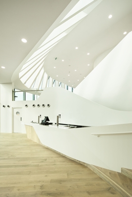 Het spel van lijnen over, om en tussen de zalen – dat is waar het ontwerp om draait. In het interieur draaien de zaalwanden onder het golvende dak weg van de gevel. Rond de zalen bewegen ook de vloer en de glazen gevel van de foyer mee naar binnen. De vloer trapt richting het plein naar beneden, en verbreedt zich tussen de zalen in. Hier vouwt een bar zich omhoog vanuit de vloer omhoog, en ontspringt een brede trap richting een verhoogde tweede foyer. Precies hier buigt de glazen gevel van de foyer zich ook naar beneden. “Zonder kolommen”, benadrukt Van Berkel. De vrije vorm wordt gedragen vanuit het dak. Zo kon de gevel aan het plein zo transparant mogelijk gemaakt worden.