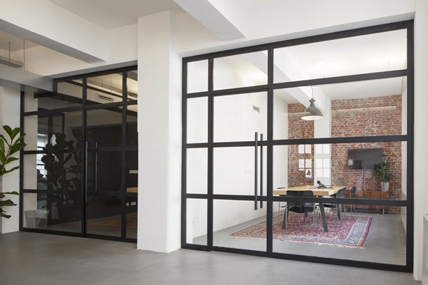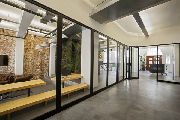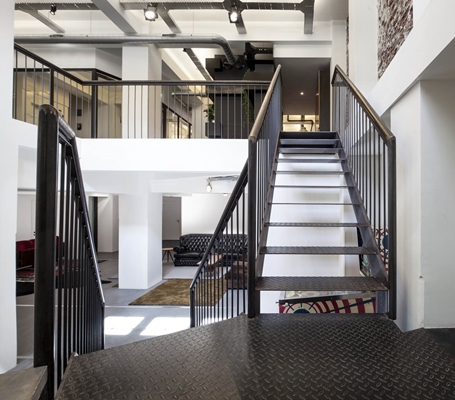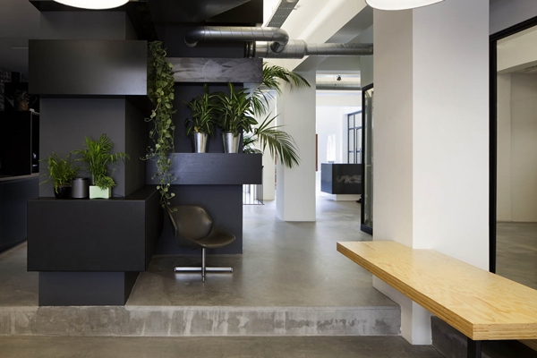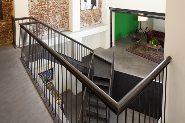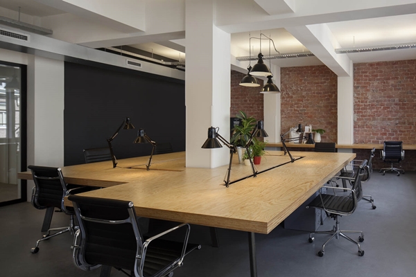 De werkplekken bevinden zich zoveel mogelijk aan grote, veelvormige tafels uit Pools grenenhout. Elke plek heeft een klassieke bureaulamp als extra werkverlichting. Dit zijn overigens warme toevoegingen in het verder zeer industriële interieur met zijn strakke vormgeving, overwegend zwart-witte uitvoering en op vele verdiepingen toegepaste stalen puien als ruimtescheiding. Eerder een warm dan een rauw accent zijn ook de afgebikte wanden, waardoor op bijna elke verdieping bij een wand het metselwerk zichtbaar is.