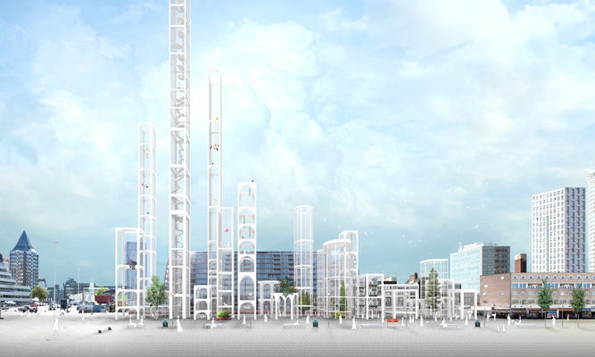 Uit een uitgebreid onderzoek naar Rotterdam trekt architect Marieke Kums de conclusie dat de wederopbouw van Rotterdam bijna voltooid is: de laatste lege kavels worden momenteel ingevuld. En veel meer gebouwen heeft de stad volgens haar niet nodig, wel programma’s. Voor verschillende dwarsassen op de Hoogstraat stelt ze ruimtelijke structuren voor die deze programma’s een plek geven. Voor een kinderrijke buurt stelt ze een verticale tuin voor, even verderop drive-in werkplekken voor ZZP-ers, de Binnenrotte wil ze met een fijnmazige infrastructuur geschikt maken voor ook kleinschaliger toe-eigening, naast de Markhal smalle hoge torens waarin Rotterdammers een eigen stukje land kunnen bezitten, en weer verderop stelt ze voor de nu al leegstaande kantoorgebouwen beschikbaar te houden voor de stad en gevraagde nieuwe kantoren hier bovenop te bouwen.