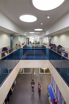De tweede verdiepingen van het gebouw worden verbonden door drie vides, die er tevens voor zorgen dat daglicht diep de school kan binnendringen. Doordat er in het interieur veel glas is toegepast heeft de school, ondanks de drie bouwen, een open en transparant karakter.