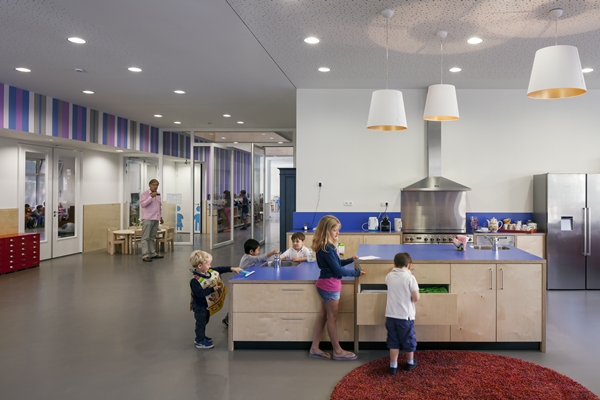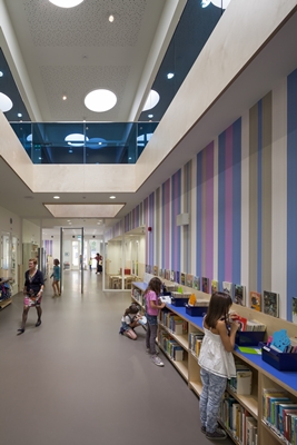 “In het hart van het gebouw bevindt zich de aula. Een brede multifunctionele verbindingsstraat verbindt al deze functies. Hier is ruimte om elkaar te ontmoeten, kunnen kinderen zelfstandig buiten de klas werken en is volop plek om te spelen.”