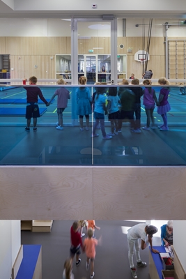 “De ruimtelijkheid en flexibiliteit wordt nog vergoot doordat ook de sportzaal en BSO onderdeel zijn van de school. Ook hier is veel glas toegepast, zodat de transparantie wordt gewaarborgd”, zegt De Zwarte Hond.