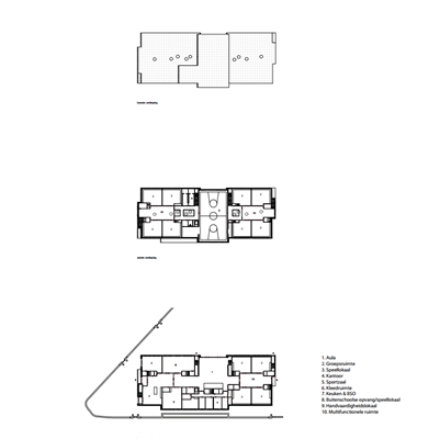 “De onderbouw ligt op de begane grond en de midden- en bovenbouw aan weerszijden van de sporthal op de verdieping. De BSO, het speellokaal, het technieklokaal en de keuken liggen bij elkaar op de begane grond naast de hoofdentree”, zegt het bureau over de hoofdopzet.