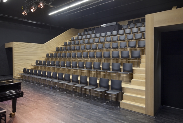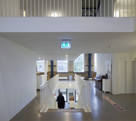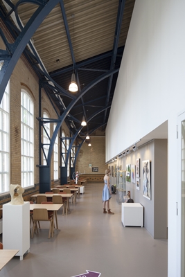 Genoemde elementen zijn samen met de heldere ritmiek van stalen spanten en hoge vensters op de verdieping, zijn samen met het geglazuurde schoon metselwerk beeldbepalend in het interieur. Op de verdieping is de nieuwe invulling letterlijk los gehouden van het bestaande gebouw, waardoor eisen met betrekking tot geluid en comfort haalbaar zijn.