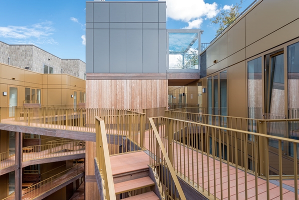 Het interieur van het gebouw vormt niet alleen door de menselijke maat en de gevarieerde invulling van de ruimte een groot contrast met het exterieur. Ook het materiaal- en kleurgebruik aan de binnenzijde van het blok moeten bijdragen aan een warm 'thuisgevoel', aldus AMR. Zo is er ruim gebruik gemaakt van azobehout en is bij kozijnen en gevelbeplating gekozen voor goudkleurig aluminium.