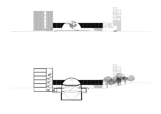Elk gebouw heeft een specifieke gevelafwerking die de absolute vorm en het solitaire karakter versterkt. Columbus heeft een witte naadloze koepel van spuitbeton die wordt voorzien van een grafische weergave van de wereldbol. Cube krijgt een reflecterende gordijngevel van gepolijst aluminium, die het verticale karakter van het museum onderstreept. De bekleding van de balk bestaat uit een zwarte cassettegevel met uitstekende ribben. De industriële gevelafwerking van de bovengrondse gebouwen contrasteert met het aardse karakter van de rode betonnen onderwereld, stelt het architectenbureau.