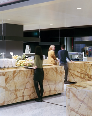 Om meer kleur en tactiliteit in het interieur te brengen, zijn aan de oorspronkelijke materialen (beton, tegels en marmer) nieuwe materialen toegevoegd, zoals het zwarte mozaïek in de toiletten en het hout in het restaurant en de bar. Tijdens het ontwerpproces is veel overleg gevoerd met Wim Quist, meldt Powerhouse Company.
