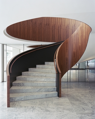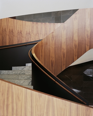 Een wenteltrap in het souterrain leidt de bezoeker naar de lobby op de begane grond. Boven de trap hangt een spiraalvormig lichtobject, bestaande uit 160 elementen, dat is ontworpen door Nanne de Ru van Powerhouse Company. Clusters van klassiek modernistische banken, fauteuils en salontafels geven de ontmoetingsruimte een informele sfeer.