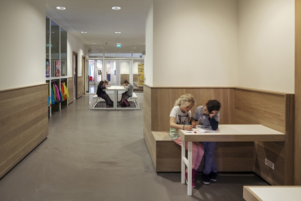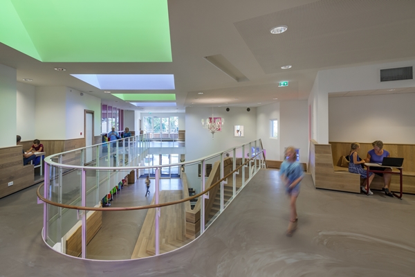 De eikenhouten trap kan hierbij als showtrap of podium worden ingezet. De trap gaat over in een eikenhouten lambrisering, die zorgt voor een warme, huiselijke sfeer. In de lambrisering zijn nissen en ‘treinzitjes’ gecreëerd waar leerlingen zelfstandig of in groepen kunnen werken. In het interieur is op een aantal plekken heldere kleuren toegepast als vrolijk detail.
