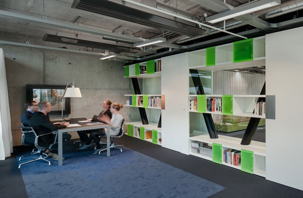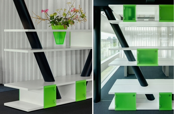 heeft het interieur voor het nieuwe kantoor van Fonds 21 in het Utrechtse bedrijfsverzamelgebouw Creative Valley ontworpen. Bepalend zijn twee witte open kastenwanden met een willekeurig patroon van felgroene translucente kastdeuren.