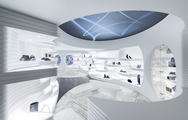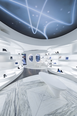 heeft voor het pand aan het Koningsplein een interieur met een dynamisch lijnenspel ontworpen. De schoenen worden gepresenteerd op translucente vlakken met geïntegreerde verlichting.