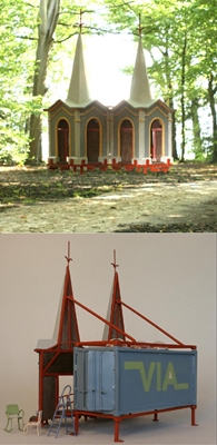 Kunstenaar Lambert Kamps ontwierp met ‘Façade’ een decorstuk van torentjes, waarachter de expositieruimte is gemonteerd in een zeecontainer. De folly ‘De koperen kamer’ van architect René van Zuuk is de tweede in een serie prijsvraagprojecten die met een CNC-schuimsnijtechniek is ontworpen (na eerder de