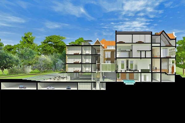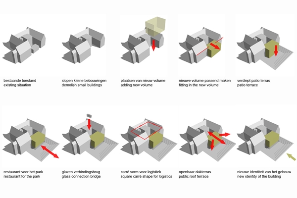 Hiervoor in plaats komt aan de achterzijde van het gebouw een nieuw te bouwen vleugel met een grondoppervlakte van 300 m2. Op deze manier komt het gebouw echt in het Oosterpark te staan, aldus de ontwerpers. De nieuwbouw sluit de binnenplaats af zodat er een carrévorm ontstaat.