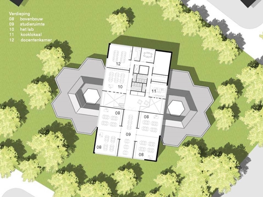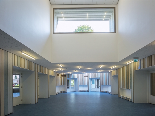 De opgave betreft in totaal 1260 vierkante meter BVO nieuwbouw en 600 vierkante meter renovatie. De oorspronkelijke gebouwstructuur van zeshoeken is zeer herkenbaar gebleven in het nieuwe gebouw. DAT heeft de structuur aangeheeld en een grote gemeenschappelijke ruimte gecreëerd voor alle aparte clusters. Van alle gebruikers van het gebouw – een basisschool met acht klassen, een peuterspeelzaal, een kinderdagopvang en een buitenschoolse opvang – grenzen de clusters aan dit centrale hart.