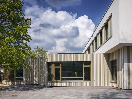 Het architectenbureau is terughoudend gebleven in materiaalgebruik: houten latten en pleisterwerk. De houten latten als gevelbekleding op de begane grond zorgen voor eenheid van oud- en nieuwbouw. De latten lopen van buiten door naar binnen, als een begeleiding van de looproute van de entrees naar de gemeenschappelijke ruimte.