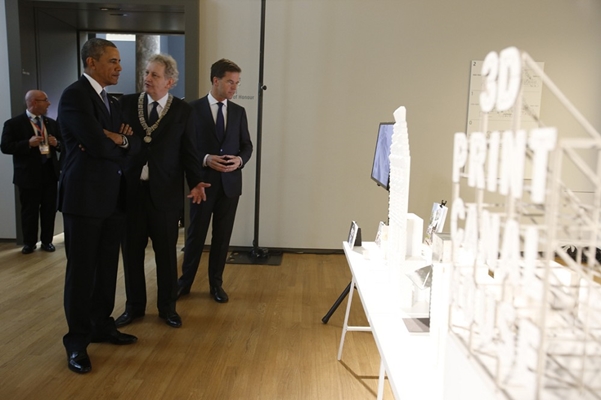 Copyright: Barack Obama bekijkt het 3D-geprinte grachtenhuis in het Rijksmuseum ( DUS architects)