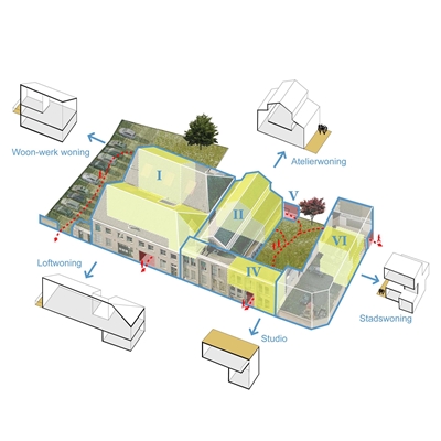 in Leiden wordt getransformeerd naar een ‘woonfabriek’ met zestien woningen. Een deel van de woningen wordt gerealiseerd in de oude casco’s van de fabriek en een deel wordt nieuw gebouwd, zodat er een sfeervol hofje ontstaat. Een groep particulieren neemt de transformatie voor zijn rekening.