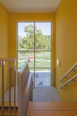 Terwijl bij veel projecten volgens passief bouwen wordt gekozen voor grote raamvlakken – met name in de zuidgevels, heeft Spring Architecten een andere afweging gemaakt. Lage ramen voorkomen hinderlijke lichtinval; in brede stroken geplaatst bieden ze toch een panoramisch uitzicht op de parkachtige omgeving. Ook ter plaatse van het 'grand café' en de entrees zorgen grote puien voor een contact tussen interieur en exterieur.