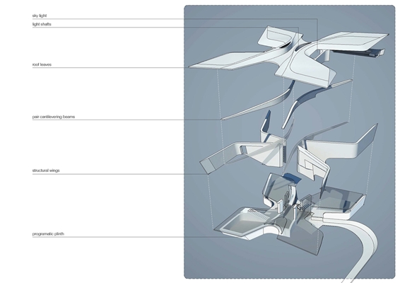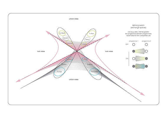 De woning bestaat uit vier vleugels rond de kern. Dit creëert zichtlijnen die elkaar kruisen in het hart van het huis. Verticaal zijn de ruimtes rondom een centraal punt georganiseerd. Kern van de organisatie van het gebouw is de open trap, die de vleugels aan de voor en achterzijde met elkaar verbindt.