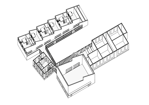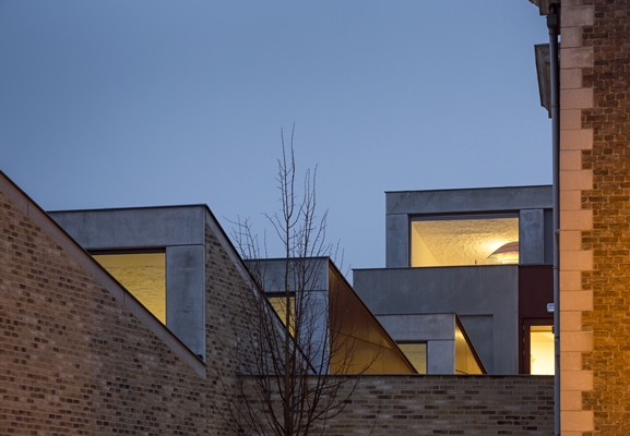 De aanbouw heeft een ingetogen karakter, met een lichte soort baksteen aan de buitenkant en houten panelen aan de hofzijde. Het noorderlicht valt door de hoge dakramen van de sheddaken en het daglicht schijnt zacht gefilterd door de raamkasten van de patiogevel naar beneden. Met behulp van installaties wordt gezorgd voor een aangenaam binnenklimaat en frisse lucht.