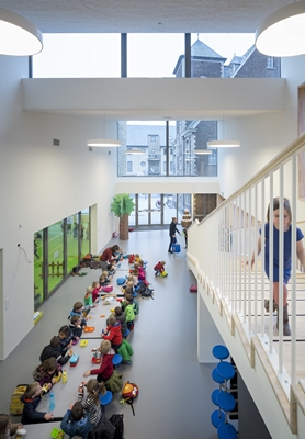 . Hij ontwierp een letterlijk drempelloze school met flexibele ruimtes. Doordat de lokalen drie tot vijf meter hoog zijn, is er ook ruimte voor insteekverdiepingen met extra leerplekken.