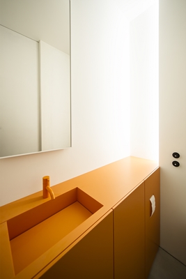 Het open gedeelte en de backoffice zijn gescheiden door een wand die doorloopt in een groot draaiend vlak. Achterin de backoffice is een kitchenette en een toilet gesitueerd, waarbij het fel oranje meubel de volledige ruimte kleurt.
