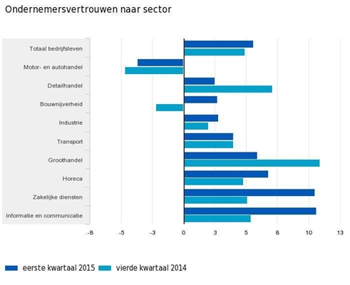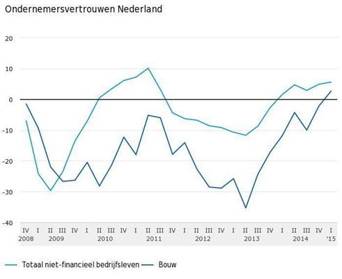 Het vertrouwen bij de bouwondernemingen is in het eerste kwartaal van 2015 gegroeid van -2,2 naar +2,7. Daarmee is het ondernemersvertrouwen in de bouw voor het eerst sinds de start van de meting in 2008 positief. Ook is de bouw niet langer de bedrijfstak met het laagste vertrouwen.