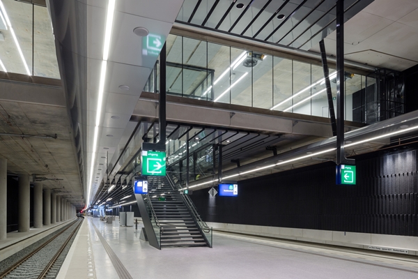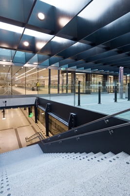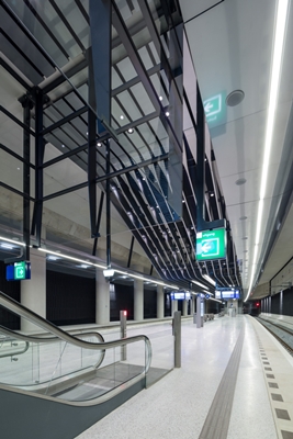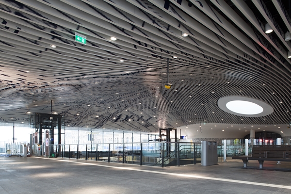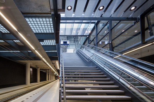 De manier waarop licht is ingezet moet, evenals het kolom- en obstakelvrij houden van de perrons, voor veiligheid en overzicht zorgen. De verticaal hangende aluminium lamellen verlagen het plafond en daarmee de schaal van het ondergrondse deel, terwijl ze tevens door hun vorm en richting reizigers ‘de weg’ richting de mezzanine wijzen.
