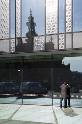 Wie vanuit het ondergrondse station de trap naar de hal neemt, ziet een golvend plafond met daarop een historische kaart van Delft uit 1877. Niet veel later komen ook de met verschillende tinten ‘Delfts’ blauw betegelde kolommen in beeld. En wie eenmaal boven is, krijgt via de glazen gevels en het venster aan pleinzijde een hedendaags gezicht op Delft cadeau.