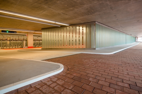 van voldoende natuurlijk licht te voorzien. Een glazen vloer in het bovengelegen stationsplein en glazen wanden tussen de mezzanine en aangrenzende functies dragen hier aan bij, plus de doorschijnende lamellen boven de perrons.