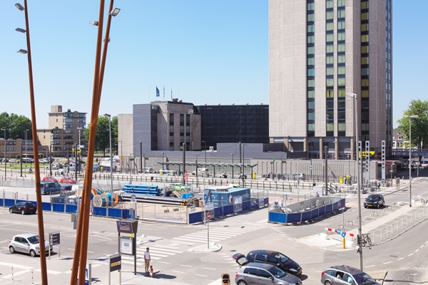 Aan de rechterzijde van de muur is ruimte gereserveerd voor het aanbrengen van het logo van NH Hotels. Het markeert de entreezijde van het hotel, gezien vanaf de uitgang van de het centraal station.