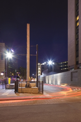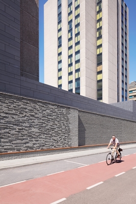 Het plaatmateriaal is toegepast bij het het vluchttrappenhuis van het hotel, gesitueerd aan de linkerkant van de muur, en houdt de installaties op het dak uit het zicht. De platen zijn aangebracht in een natuursteenpatroon, subtiel verwijzend naar de materialisering van het plein.