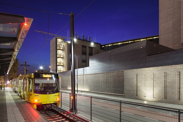 Nabij de gevel is een taxistandplaats en een nieuwe tramhalte. Voor het wachtende publiek heeft het architectenbureau een bankje in het ontwerp van de muur geïntegreerd. De omgeving heeft meermaals invloed gehad op het ontwerp. Zo is ook rekening gehouden met de straatverlichting, die zorgt voor mooi strijklicht.