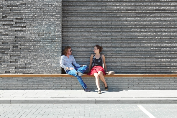 Met de rommelige aftekening van de gebouwdelen als uitgangspunt heeft het architectenbureau in een lang horizontaal gebaar weer rust in de gevel gebracht. De muur is over de gehele lengte opgebouwd uit hergebruikte gebroken stoeptegels, die op verschillende manieren zijn gemetseld.