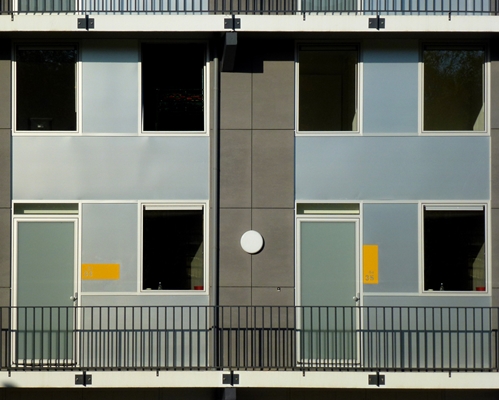 Door de verschillende elementen onderling te laten verspringen en het gebruik van verschillende grijstinten en blank geanodiseerd aluminium ontstaat door licht en schaduw een plastische gevel. De trappenhuizen zijn opengewerkt waardoor licht en doorzicht ontstaat. Elk blok ontleent zijn identiteit aan een unieke kleur in het trappenhuis en huisnummerbord bij de voordeur.