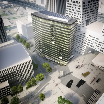 “In de onderste vier verdiepingen bevinden zich naast de royale entreehal ook het conference center, het restaurant en grand café, retail en de fietsenstalling. De dynamiek die de uitwisseling van de aanwezige functies brengt, bepaalt de sfeer en voedt de openbare ruimte.”