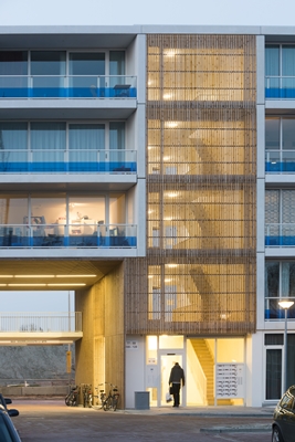 Elke woning heeft een blauw gekleurd glazen scherm voor de voordeur, wat de herkenbaarheid van de individuele woningen vergoot en zorgt voor geluidwering, ook voor het achtergelegen