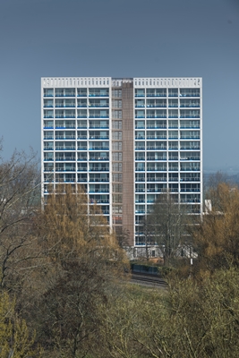 Het gebouw langs de ringweg heeft dankzij de wit betonnen gevelelementen een ingetogen uitstraling, waarbij ruime balkons aan de zuidzijde voor een levendig accent zorgen. De doorgaande horizontale lijnen van de galerijen aan de noordkant onderstrepen de lengte van het gebouw en maken de architectuur passend bij de snelheid van voorbijrijdende automobilisten.