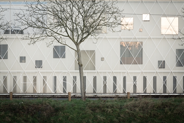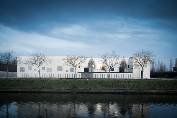 Het nieuwe drielaagse kantoorgebouw is in hoogte afgestemd op die van de bestaande loodsen en afgewerkt met witte geĆÆsoleerde gevelpanelen. Op de begane grond sluiten de volumes aan, maar op de verdiepingen is het nieuwe volume losgekoppeld van de loods. De zo ontstane noord gerichte gevels zorgen voor daglicht in de kantoren.