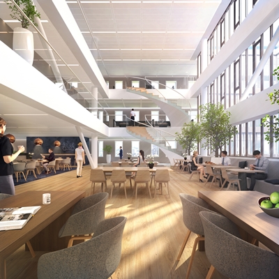 Voor de toekomstige gebruikers is in het hart van het gebouw, waar het werkrestaurant was voorzien, een vide met trap ontworpen. Deze ruimte tussen de derde en vijfde verdieping verbindt de lagen met elkaar en zorgt ervoor dat het één kantoor wordt.