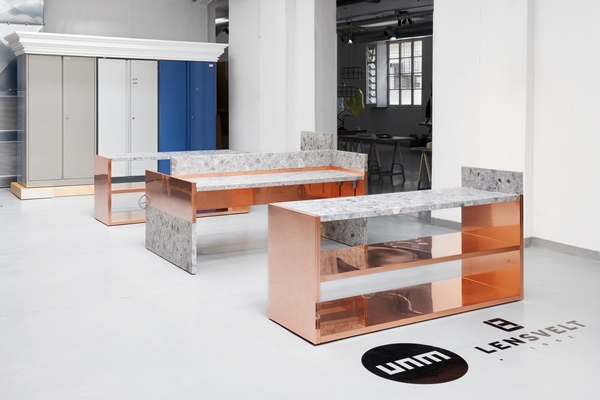 Een absolute eyecatcher vormen de werkplekken van Nina Graziosi. Het systeem UNM bestaat uit werkbladen en zijpanelen, vervaardigd uit combinaties van koper en een groffe Italiaanse marmersoor; dermate grof dat het eerder industrieel dan luxe oogt.