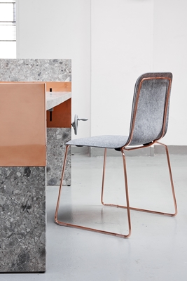 Eveneens no nonsense en stoer is de This Chair van Richard Hutten voor Lensvelt, opnieuw vormgegeven in een koperen frame met vilten kuip in verschillende tinten grijs. Uit een gepoedercoat stalen frame en koperen of bronzen blad bestaan de lage tafeltjes Contorno van Jolanda van Goor. De vormgeving is sober en vertrouwd, maar tegelijk verrassend in detaillering en de oplossing voor bergruimte.