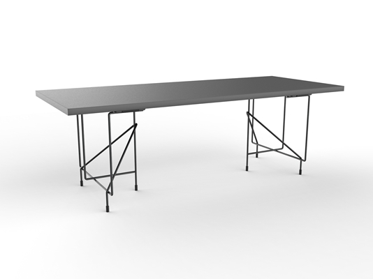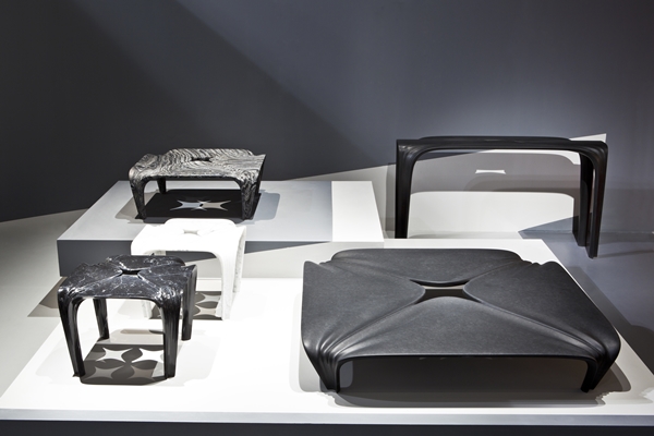 Bijzonder fraai afgewerkt zijn de meubels, uitgevoerd in hout en blauwgrijs gecoat staal, met een omkeerbare 'topping' van de Noorse ontwerper Alexander Åsgård. De dienbladen, strak passend binnen de afgeronde opstaande randen van het meubel, worden omgedraaid tot kussens en de tafels en bergmeubels worden zitmeubels. Mariko Sujimoto plaatst een kritische noot bij de talloze luxeproducten die elk jaar weer worden getoond op de beurs, door producten te maken uit afgedankte gebruiksvoorwerpen, zoals een kroonluchter uit half gesmolten kleerhangers.